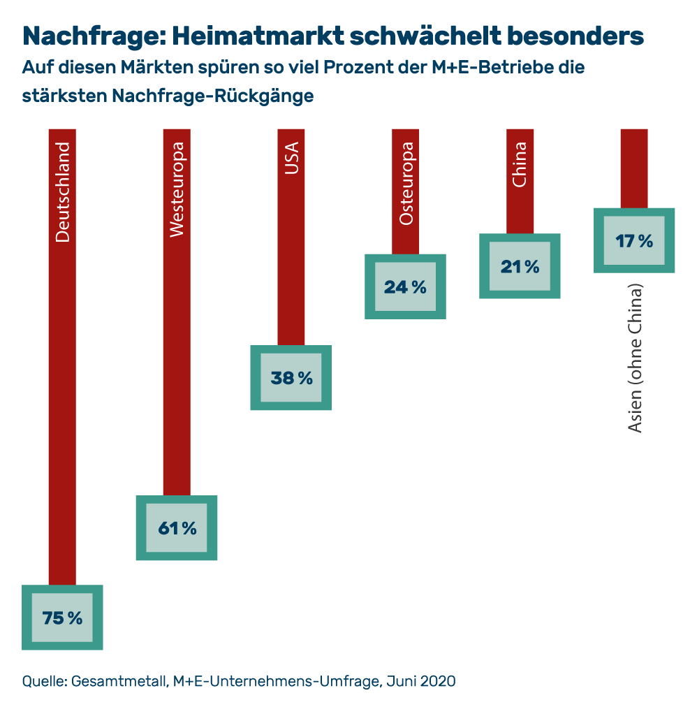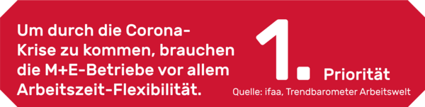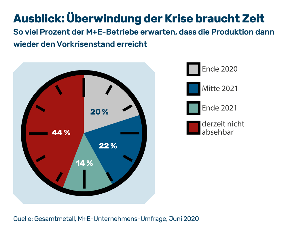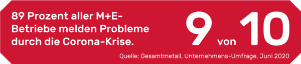 Die Betriebe der Metall- und Elektro-Industrie bauen auf eine wirtschaftliche Erholung. Die allermeisten rechnen damit aber frühestens 2021. Auch das ergab die Gesamtmetall-Umfrage. Mut macht das Wissen: M+E „kann“ Krise. Das hat Deutschlands wichtigster Industriezweig oft genug bewiesen. Dazu müssen aber alle einen Beitrag leisten. Denn: Wer zusammenhält und gemeinsam anpackt, der kann auch schlechte Zeiten überstehen.