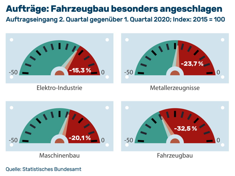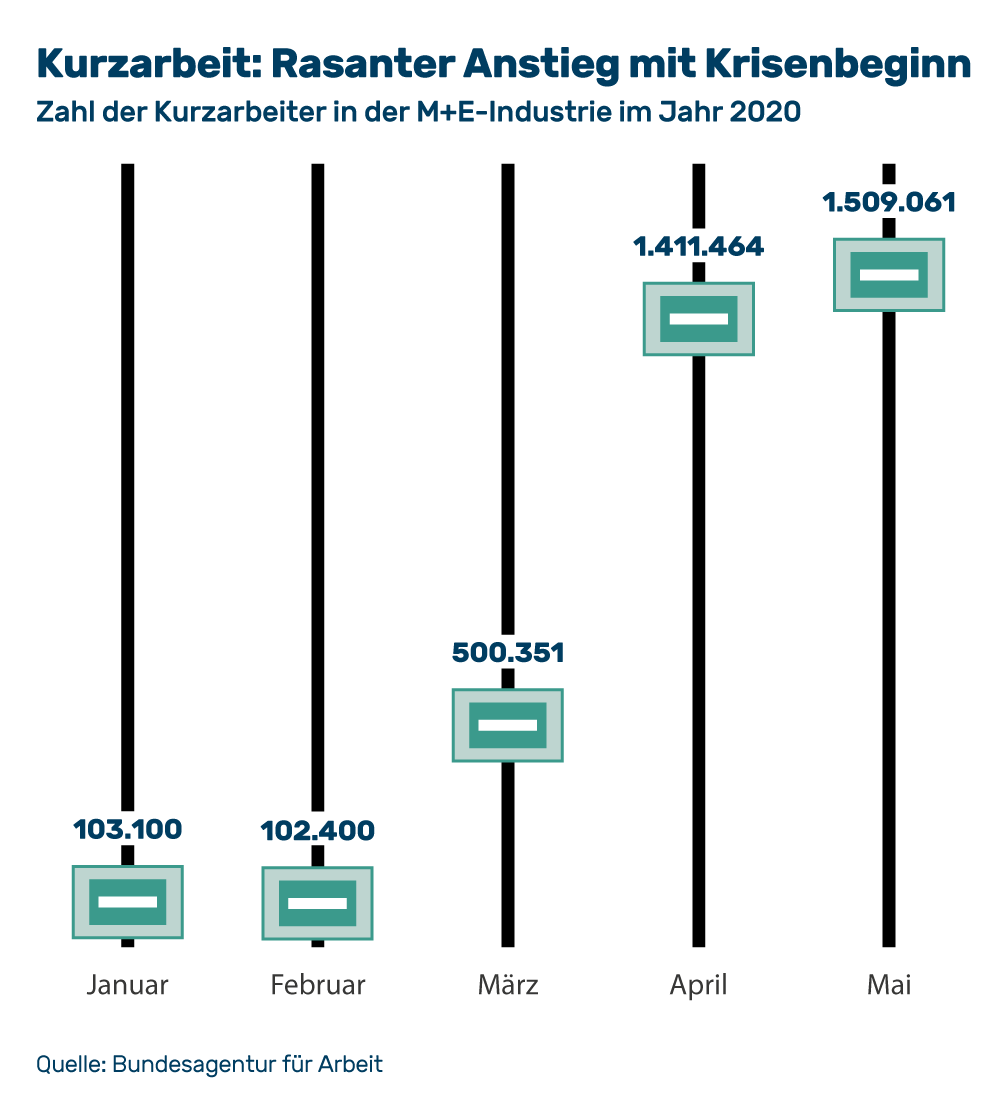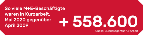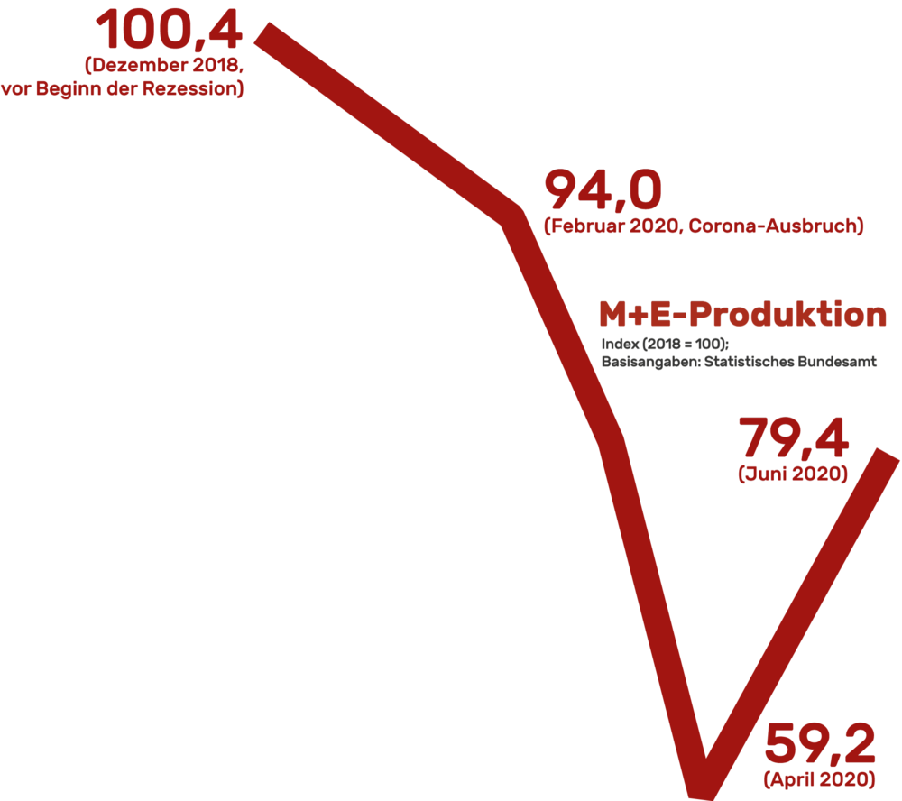 Im Sommer waren immer noch neun von zehn M+E-Betrieben von Produktions-Einschränkungen durch die Krise betroffen, 46 Prozent sogar „stark“ oder „sehr stark“. Das zeigt die jüngste Unternehmens-Umfrage des Arbeitgeberverbands Gesamtmetall. Alle Branchen sind stark angeschlagen – besonders der Automobilbau. Trotz der Einbrüche halten die Unternehmen an Beschäftigung fest, so lange es geht. Das belegen die Zahlen zur Kurzarbeit: 1,5 Millionen der insgesamt noch 4 Millionen M+E-Beschäftigten waren im Mai (aktuellster amtlicher Wert) in Kurzarbeit – mehr als je zuvor. Und das belegt auch der Vergleich zwischen Produktionseinbruch und Beschäftigungsentwicklung. Denn obwohl die Produktion um 20 Prozent unter dem Hochstand von 2018 liegt, haben die Unternehmen die Stellen nicht entsprechend angepasst: Die Zahl der Arbeitsplätze ist nur um 2,6 Prozent gesunken.