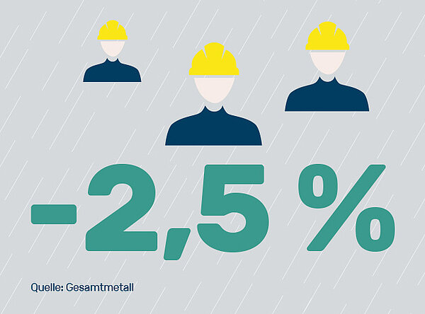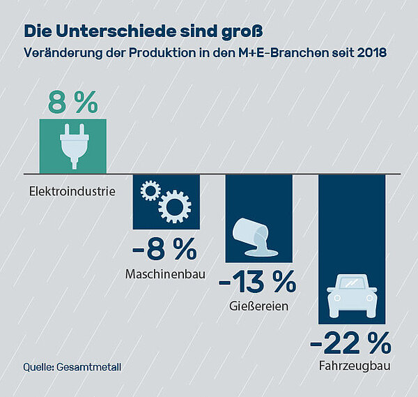 Nur wenigen M+E-Unternehmen geht es trotz Krise gut. Doch sehr viele, vor allem kleine und mittlere Betriebe, leiden. Besonders deutlich macht das eine Zahl: 44 Prozent der Unternehmen sehen sich angesichts der Entwicklungen sogar wirtschaftlich in ihrer Existenz gefährdet. Kurzarbeit, Arbeitsplatzabbau und Insolvenzen sind eine reale Gefahr. Dringend nötige Investitionen etwa in Digitalisierung und Fachkräftesicherung bleiben liegen. Dabei wurden seit 2018 nur 2,5 Prozent der Arbeitsplätze abgebaut, obwohl die Produktion um zehn Prozent sank. Das zeigt den großen Einsatz der Betriebe für ihre Beschäftigten.